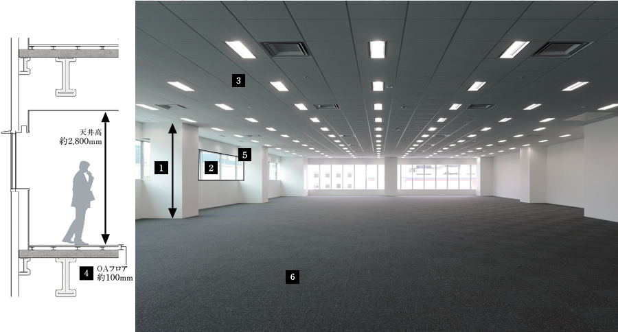 パソコンなどの配線に便利な二重床を採用。ゆとりの高さとスペースが、自由な空間レイアウトを可能にします。